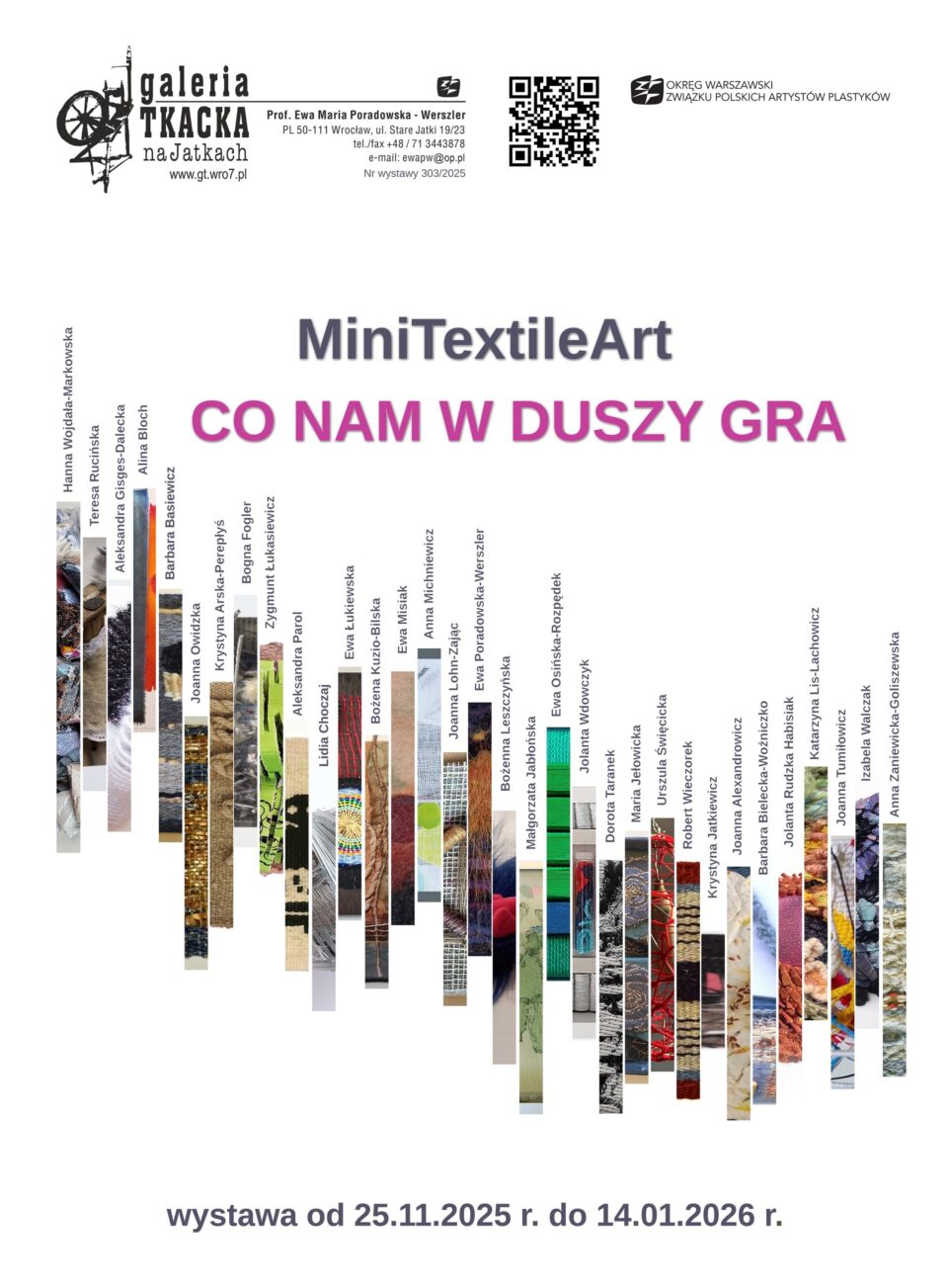 Zapraszam serdecznie  do Galerii Tkackiej „Na Jatkach” we Wrocławiu na wernisaż wystawy pt. „Co nam w duszy gra”, która pokazuje i promuje współczesną tkaninę artystyczną w miniaturowym formacie 20×20 cm. Twórcy prezentują 73 dzieła tkane, plecione, zszywane, klejone, zestawiane z kilku odrębnych elementów, płaskich i trójwymiarowych, rozwijając temat wystawy, który był przyczynkiem do rozważań związanych z